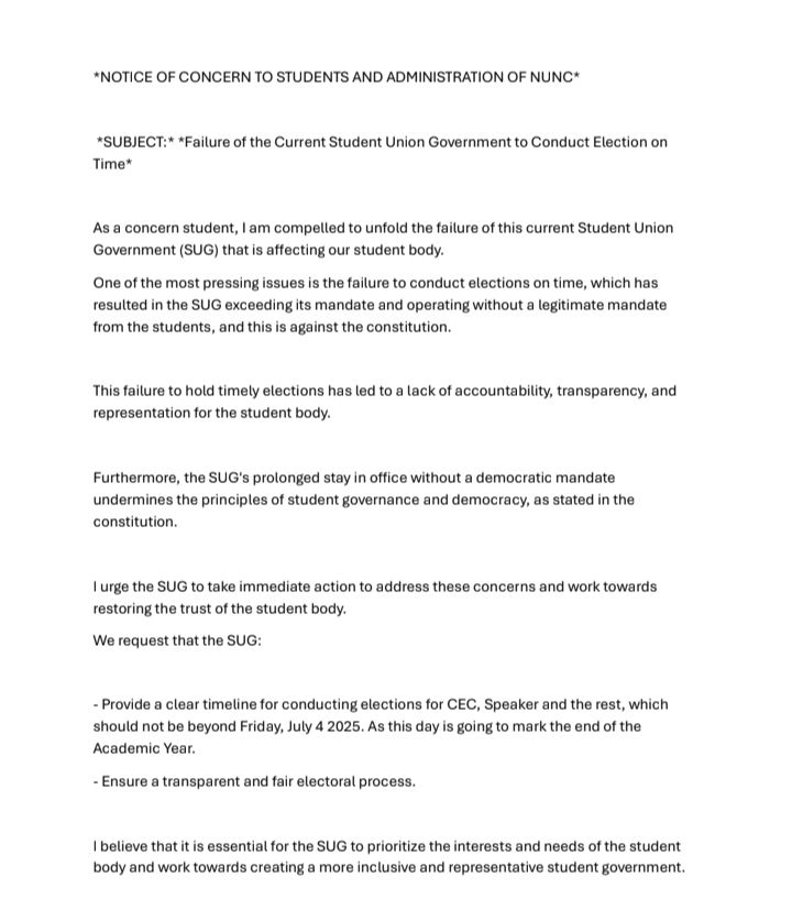 In the letter, the student argues that the SUG’s inability to hold elections has resulted in a significant lack of accountability, transparency, and representation for students. The prolonged tenure of the current government is seen as undermining the fundamental principles of student governance, which are essential for a healthy democratic process.
