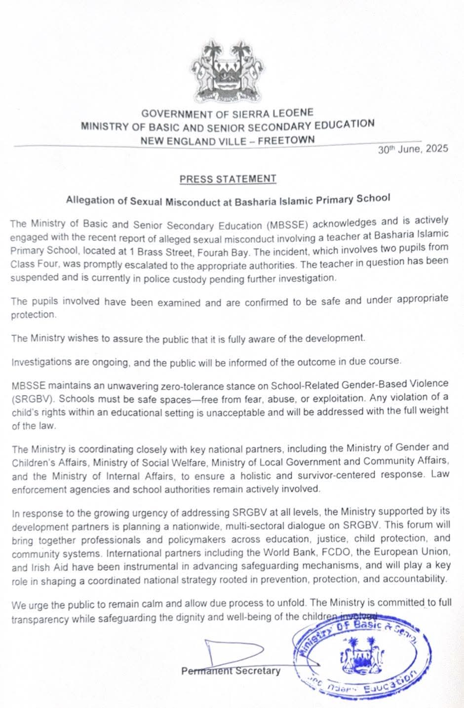 The Ministry of Basic and Senior Secondary Education (MBSSE) confirmed the arrest in a press statement today, acknowledging the recent report and stating that the teacher in question has been suspended. The individual is currently in police custody as investigations continue.