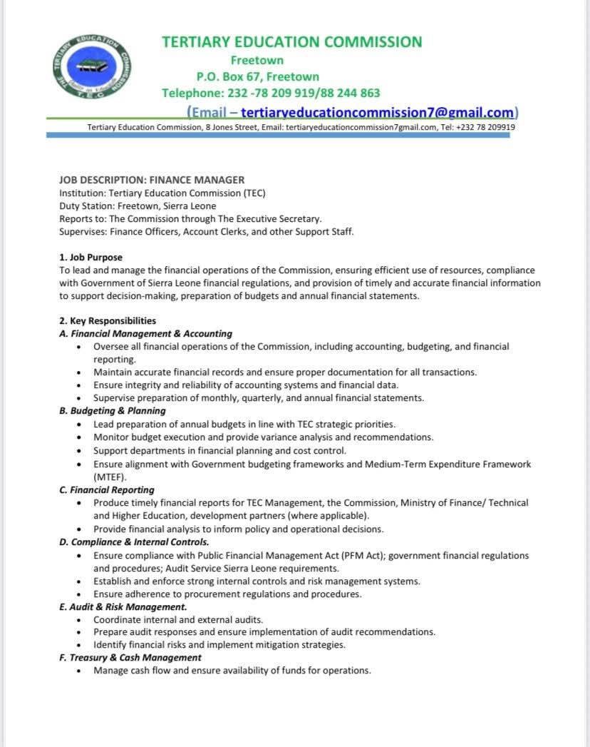 In addition, the Commission is seeking a qualified Finance Manager to ensure prudent financial management and compliance with the Public Financial Management Act. The successful candidate will be responsible for preparing annual budgets, producing financial reports for the Ministry of Finance and development partners, coordinating audits, maintaining internal controls, and overseeing donor-funded programmes, scholarships, and government subventions.