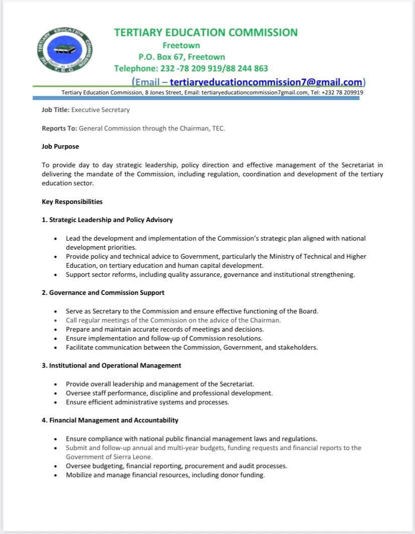 The Tertiary Education Commission has officially announced the opening of applications for two key leadership positions Executive Secretary and Finance Manager as part of efforts to strengthen governance and financial management within the country’s higher education sector.