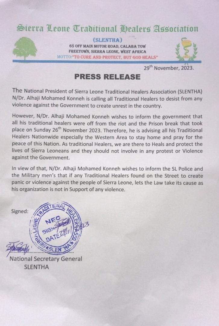 This called was made by the national president for the association, Alhaji Mohamed Konneh in a press release who informed the government and people of Sierra Leone that, the traditional healers were not part of the riot and prison break which happened on the 26th November 2023 as well as asking all members especially those in the western area to distance themselves from any issue of unrest and pray for the peaceful coexistence in the country.
