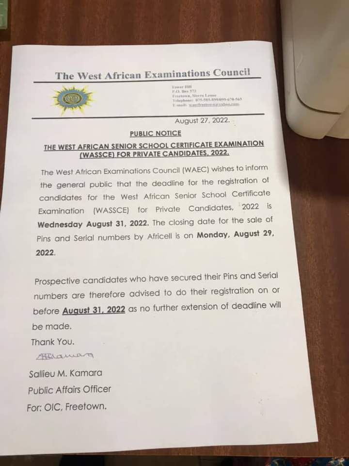 Contained in the Public Notice, is that the deadline for the registration of candidates for the West African Senior School Certificate Examination (WASSCE) for private candidates, 2022 is Wednesday the 31st August, 2022.
