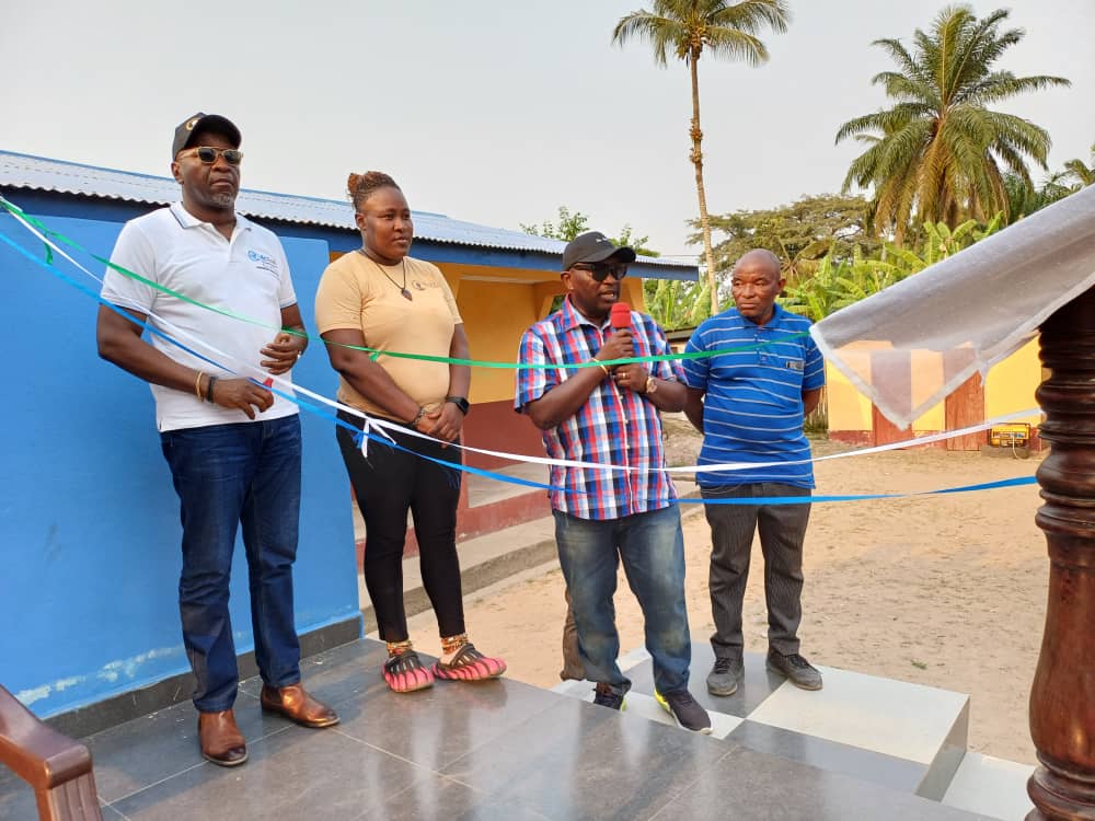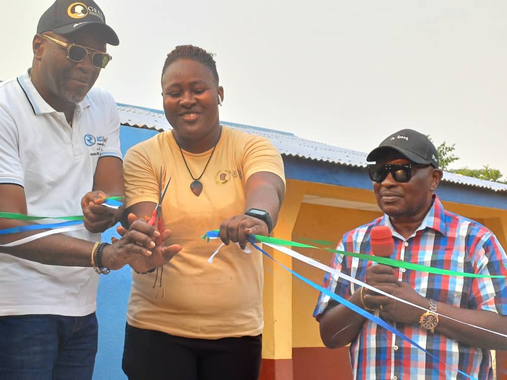 In a joint effort to commission the Podium, The Executive Director of the GEED Foundation, Asilia Gilpin, the Deputy Mayor of Bonthe District, Mr. Bangalie, the Managing Director of RCBank, Dr. Walton E. Gilpin, and Mr. Morrison Conteh, were all on stage for the ribbon-cutting ceremony.”
