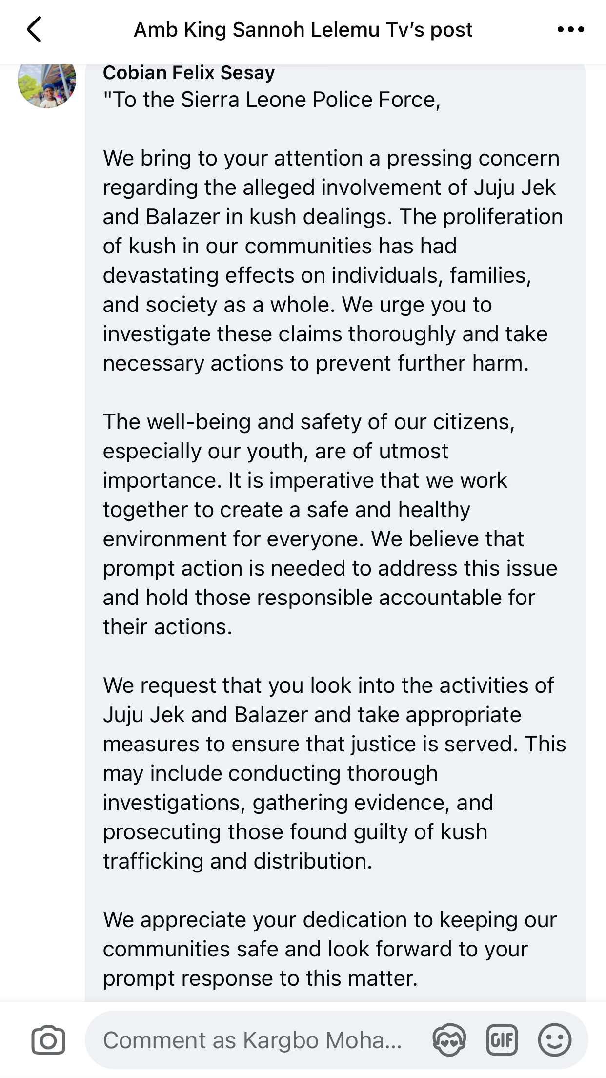 A concerned citizen, expressing the urgency of the situation, stated, “Dear Sierra Leone Police, we bring to your attention a pressing concern regarding the alleged involvement of Juju Jek and Blazer in kush dealings. The proliferation of kush in our communities has had devastating effects on individuals, families, and society as a whole. We urge you to investigate these claims thoroughly and take necessary actions to prevent further harm.”