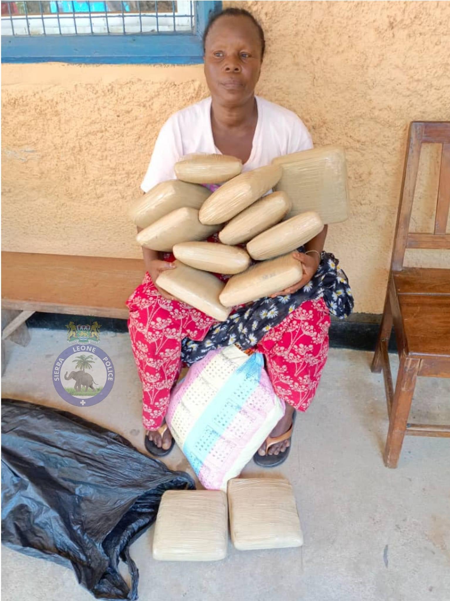 police stationed at the Gelehun Checkpoint along the Pujehun-Liberia border highway arrested 60-year-old Jeneba Kallon for allegedly trafficking suspected cannabis sativa.
