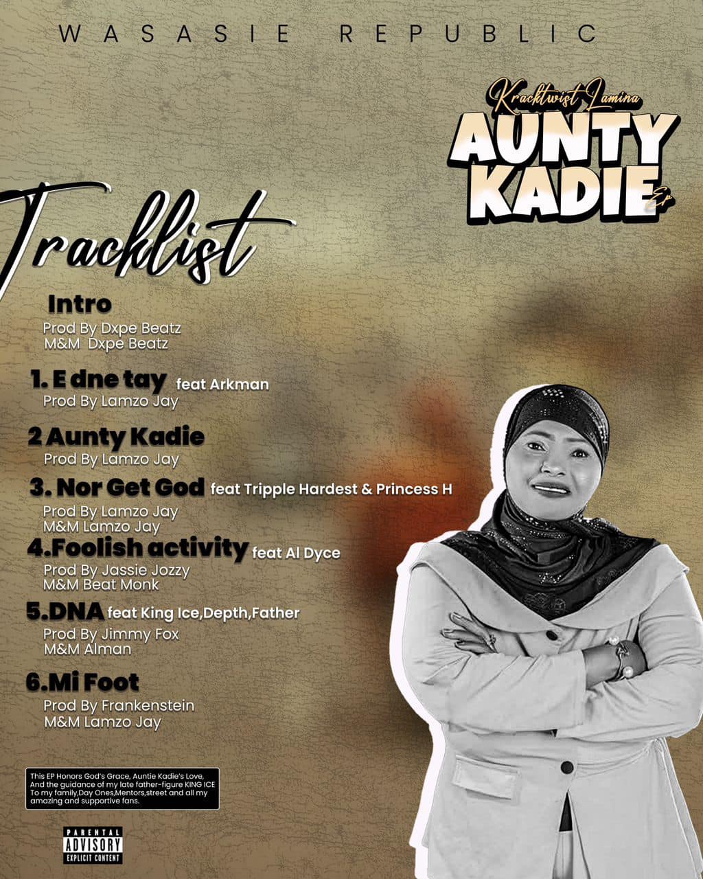 Kracktwist also brought talented musicians like Arkman, Princess H, Al Dyce, and others to bless his EP. Every track carries a genuine vibe and a message listeners can connect to. “Aunty Kadie” EP is released by Wasasie Republic.