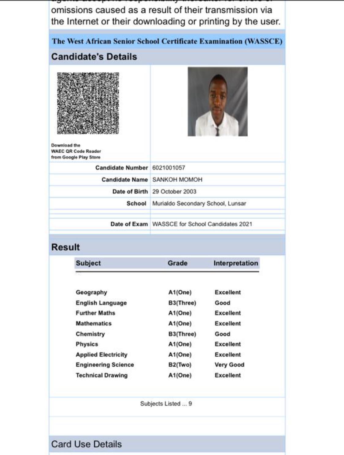 The 18 year old sat to 9 Subjects and and was able to passes all 9. According to the analysis of Conteh’s result, he got A-1 in Geography, B-3 in English Language, A1 Excellent in Mathematics, B3 Good in Chemistry, A1 -one Physics, A1-one Applied electricity, and B-3 which very good.