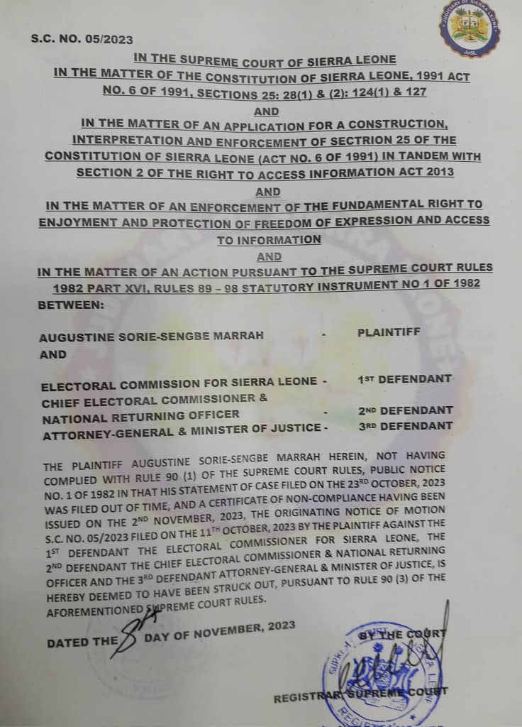 The Supreme Court of Sierra Leone has struck out the matter filed by Augustine Sorie-Sengbe Marrah Esq against the Electoral Commission for Sierra Leone (ECSL), Chief Electoral Commissioner, and Attorney General and Minister of Justice for non-compliance with the Supreme Court Rules 1982.