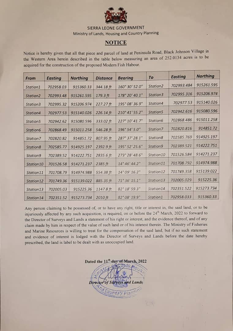 The Ministry of Land and Country Planning has on a public notice issued today disclosed that 252.0134 acres of land is to be acquired for the construction of a Modern Fish Harbour at Black Johnson Village, in the Western Area.