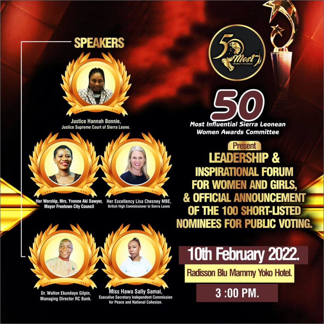 On the 10th February 2022, the Fifty Most Influential Sierra Leonean Women Award at Radisson Blu, Mammy Yoko Hotel, announced list of the 100 shortlisted women for public voting.