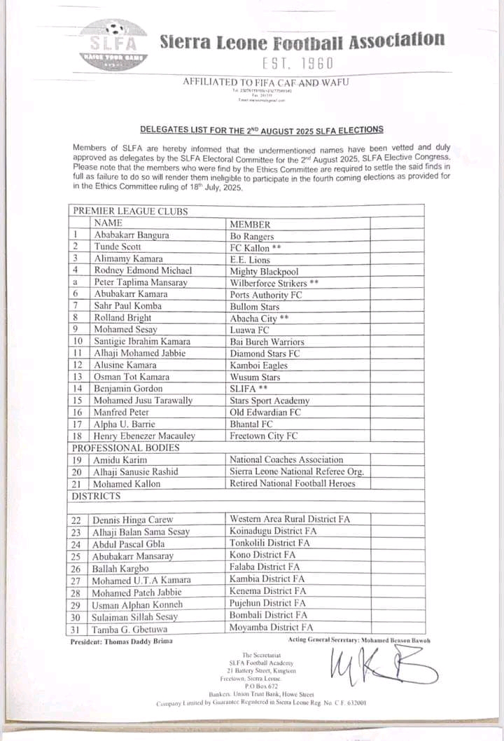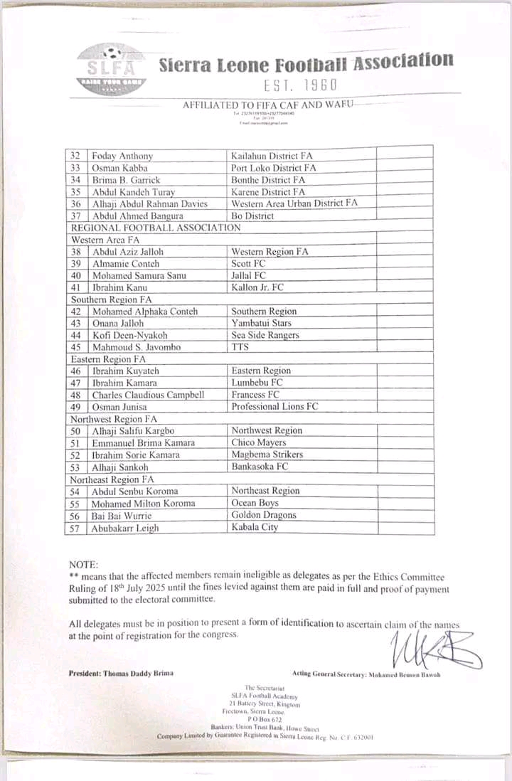 A total of 57 delegates have been officially vetted and approved to take part in the Sierra Leone Football Association (SLFA) Elective Congress scheduled for Saturday 2nd August 2025.