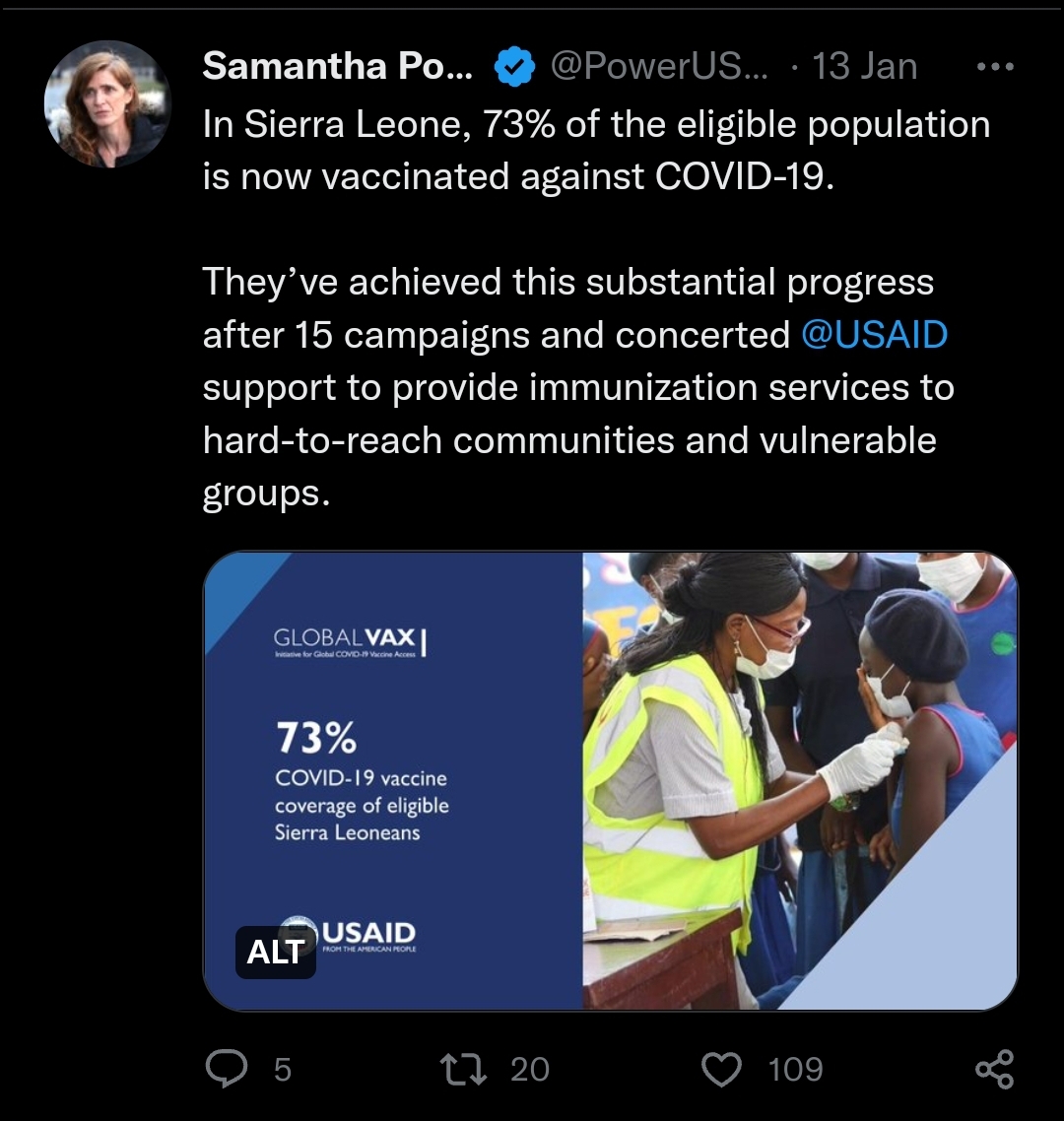 USAID Administrator Samantha Power has stated that 73% of the eligible population in sierra Leone has now been vaccinated against COVID-19