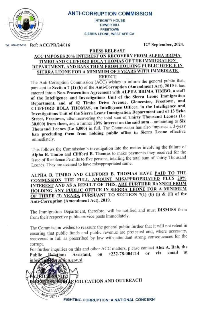 The Anti-Corruption Commission (ACC) of Sierra Leone has imposed financial penalties and a three-year ban from public office on two officials of the Sierra Leone Immigration Department following a Non-Prosecution Agreement.