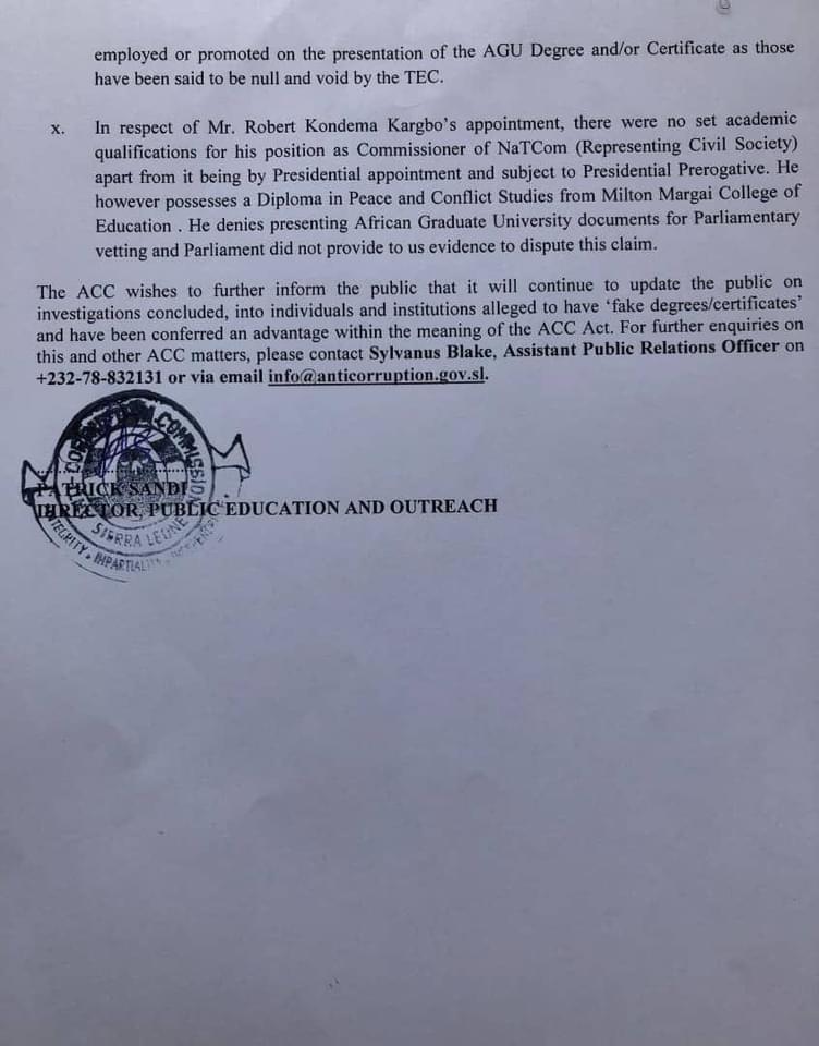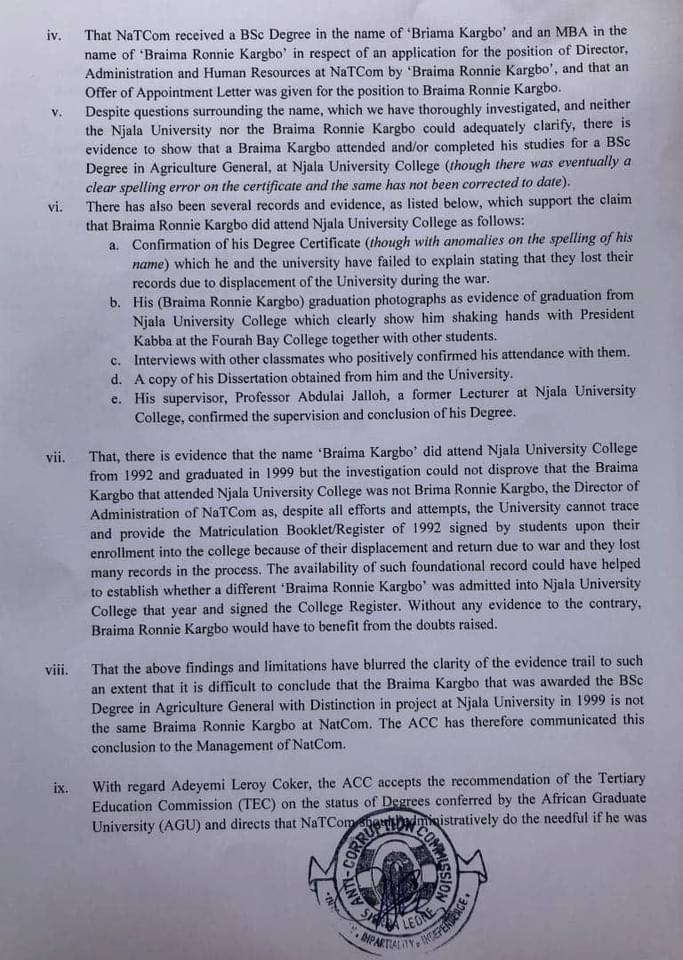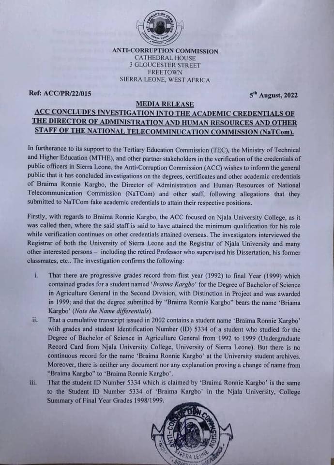 “The Anti-Corruption Commission (ACC) wishes to inform the general public that it has concluded investigations on the degrees, certificates and other academic credentials of Braima Ronnie Kargbo, the Director of Administration and Human Resources of National Telecommunication Commission (NaTCom) and other staff, following allegations that they submitted to NaTCom fake academic credentials to attain their respective positions,” ACC stated.