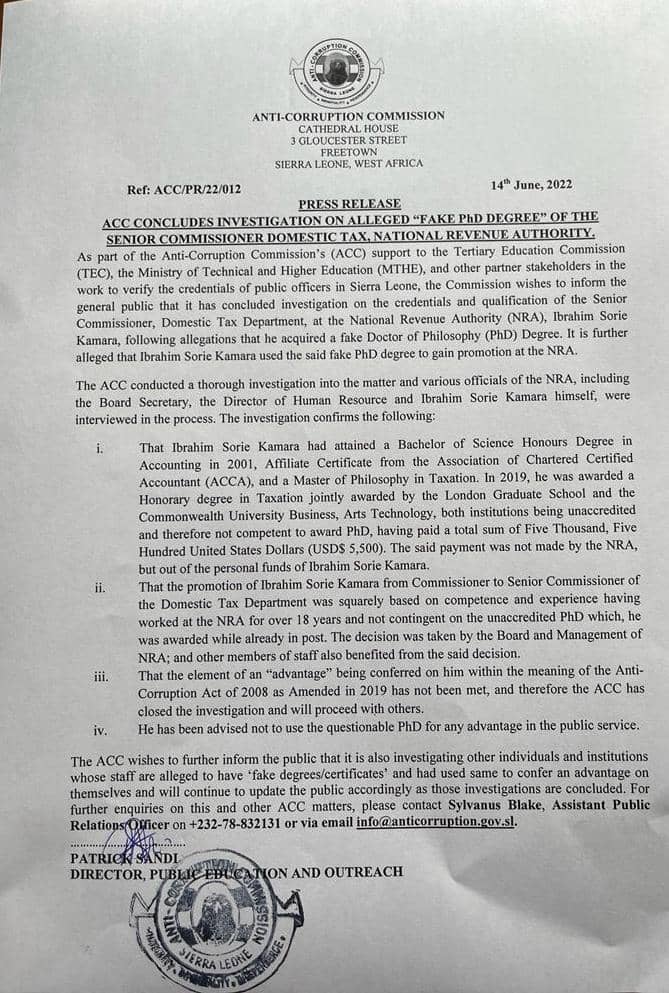 “As part of the Anti-Corruption Commission’s (ACC) support to the Tertiary Education Commission (TEC), the Ministry of Technical and Higher Education (MTHE), and other partner stakeholders in the work to verify the credentials of public officers in Sierra Leone, the Commission wishes to inform the general public that it has concluded investigation on the credentials and qualification of the Senior Commissioner, Domestic Tax Department, at the National Revenue Authority (NRA), Ibrahim Sorie Kamara, following allegations that he acquired a fake Doctor of Philosophy (PhD) Degree. It is further alleged that Ibrahim Sorie Kamara used the said fake PhD degree to gain promotion at the NRA.