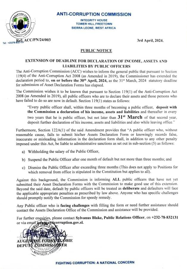 The Anti-Corruption Commission (ACC) of Sierra Leone has issued a public notice extending the deadline for the submission of Income, Assets, and Liabilities declaration by public officers. The notice, released on April 3rd, 2024, emphasized the importance of compliance with the Anti-Corruption Act 2008, as Amended in 2019.
