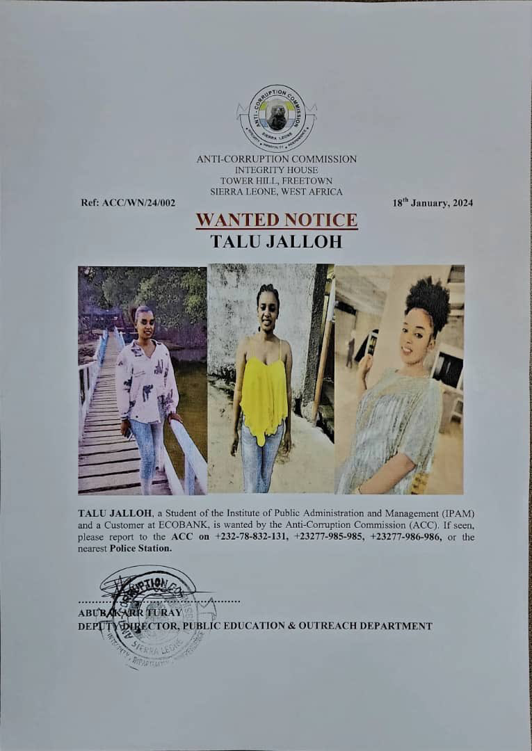 Also wanted are Talu Jalloh, a student at the Institute of Public Administration and Management (IPAM) and a customer at ECOBANK.