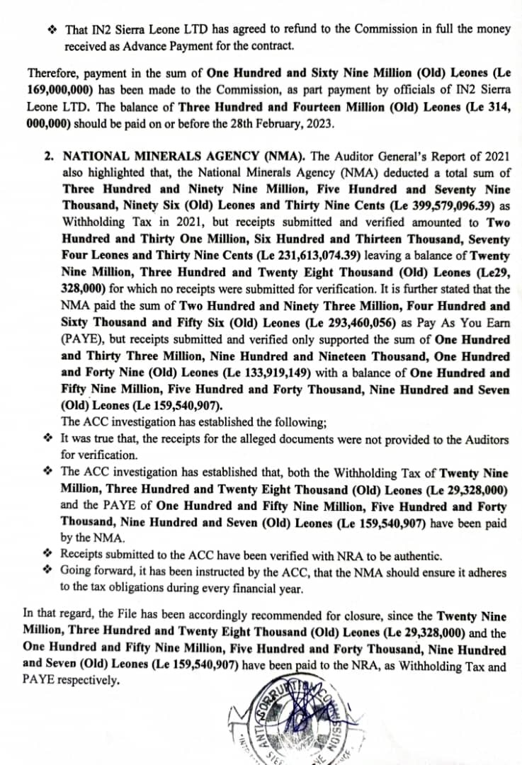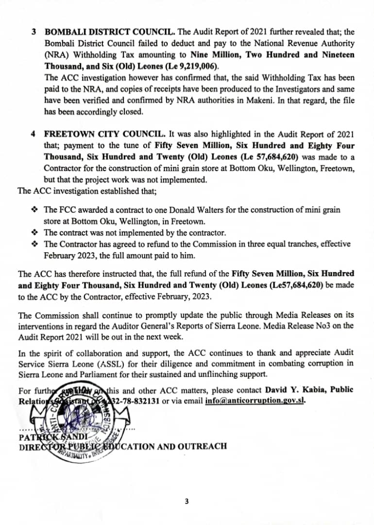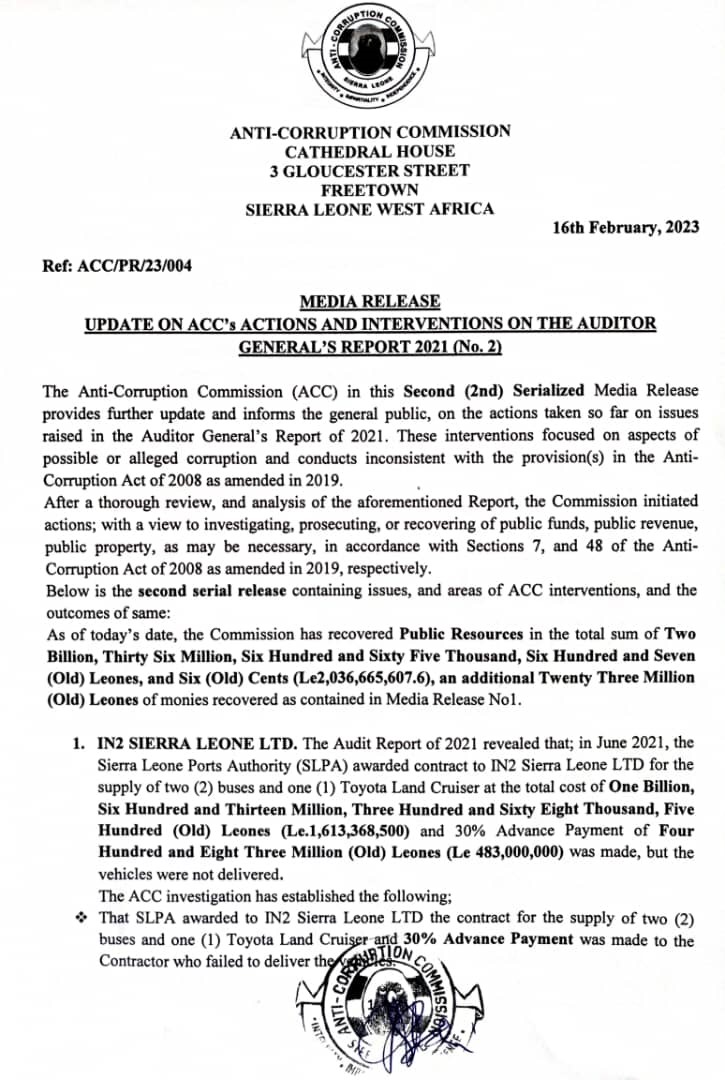 The Anti-Corruption Commission (ACC) of Sierra Leone has provided a further update on the actions taken so far on issues raised in the Auditor General’s Report of 2021 in the Second (2nd) Serialized Media Release.