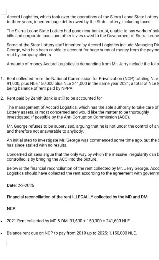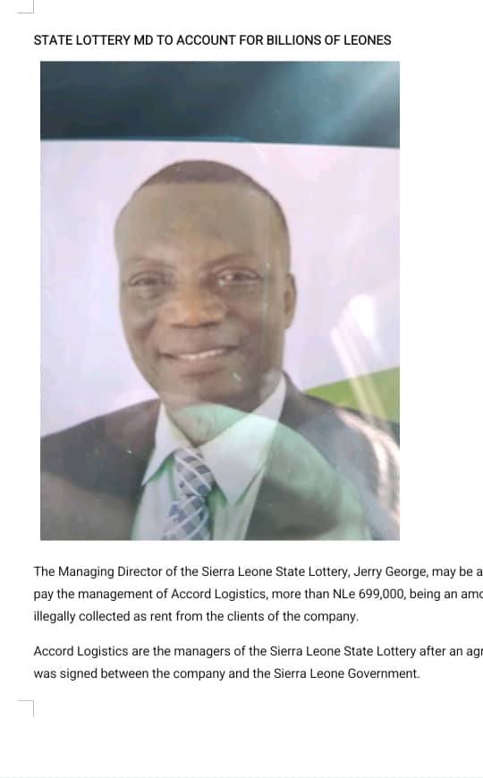 The Managing Director of the Sierra Leone State Lottery, Jerry George, is facing serious allegations of financial misconduct, with the management of Accord Logistics accusing him of collecting and failing to account for large sums of rent belonging to the institution.