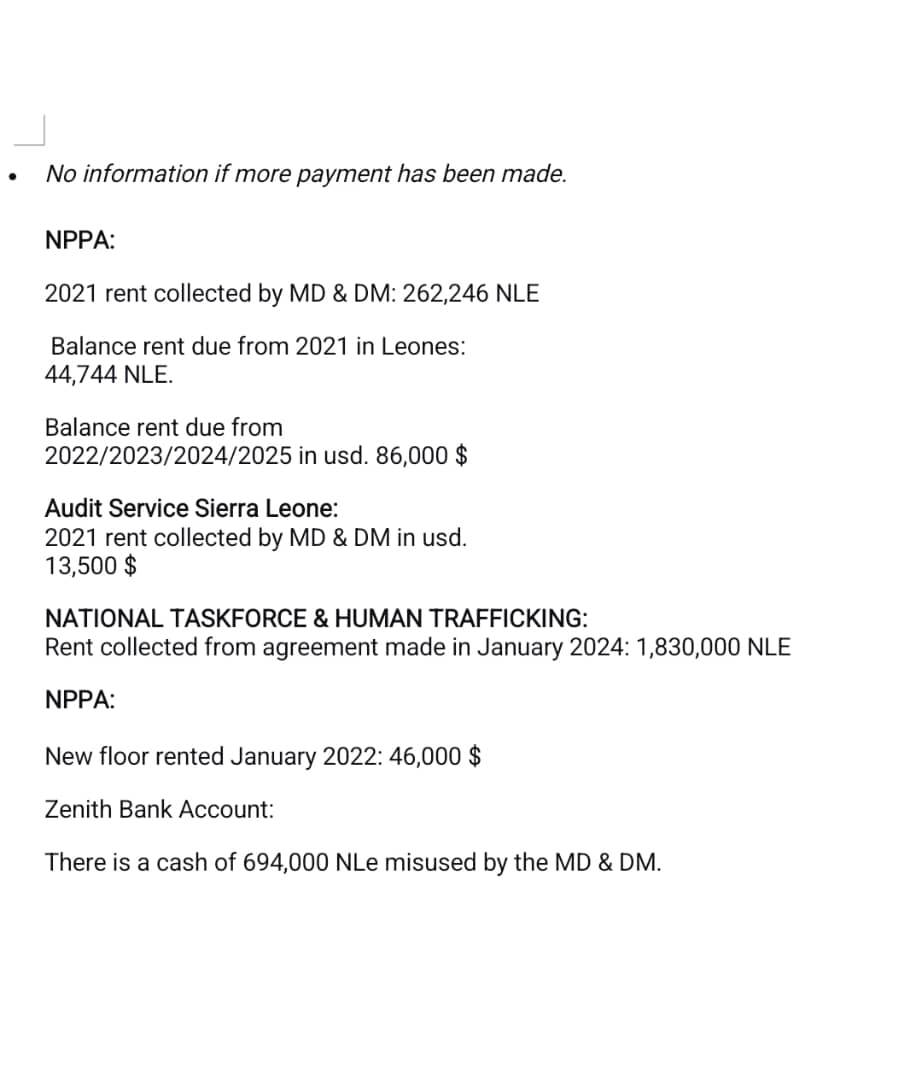 In addition, the reconciliation alleges that US$13,500 in rent was collected in 2021 from Audit Service Sierra Leone. It also states that rent amounting to NLe 1,830,000 was collected under an agreement signed in January 2024 with the National Taskforce on Human Trafficking.