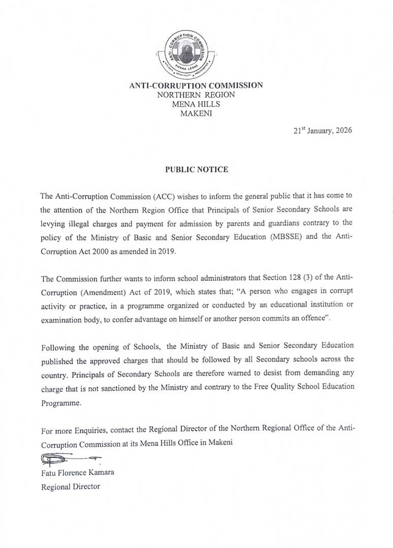In a statement released on 21 January 2026, the ACC reminded school administrators that Section 128 (3) of the Anti-Corruption (Amendment) Act 2019 prohibits engaging in corrupt practices in programmes organized by educational institutions. The section stipulates that anyone involved in such activity, whether to benefit themselves or another person, commits an offence.