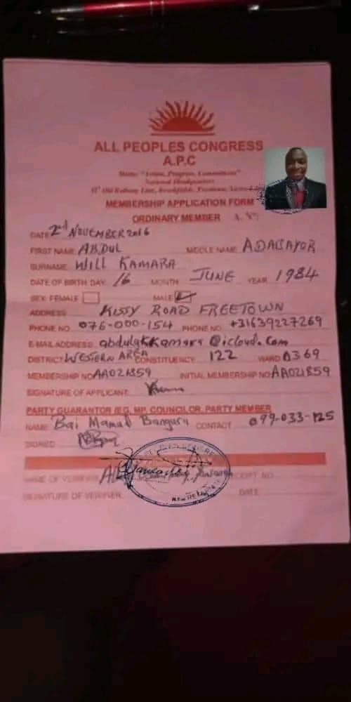 Sierra Leonean Activist, Social justice Advocate and Political commentator, Adebayor has today faced his nightmare as his APC membership card emerges on social media after all the pretending for years.