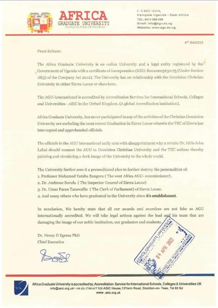 The press release was issued following claims from Dr. Idriss John Lahai doubting the legal status of the university, and alleging that they are also awarding fake PhDs like Dominion Christian University.