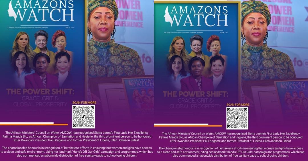 The African Ministers’ Council on Water (AMCOW) has recognized Sierra Leone’s First Lady, Her Excellency Fatima Maada Bio, as the African Champion of Sanitation and Hygiene, making her the third prominent personality to receive the honor after Rwanda’s President Paul Kagame and former Liberian President Ellen Johnson Sirleaf.