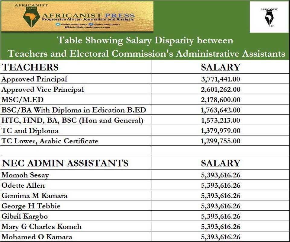 Africanist Press  alleged that they found that senior teachers, who hold Master’s degrees and post-graduate diplomas, are also earning monthly gross salaries that are below Le2.1 million; two times less than the monthly salaries of administrative assistants without Bachelor’s degrees at the Sierra Leone Electoral Commission who are paid more than Le5.3 million monthly.