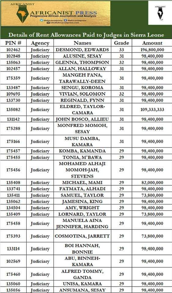 According to Africanist Press, the list, comprises a total sample of 29 judges drawn from the Supreme Court, the Courts of Appeal, and the High Court, shows that on average judges receive between Le73,800,000 and Le98,400,000 in rent allowances alone, adding that these rent allowances do not include other payments for salaries, medical benefits, leave bonuses, transportation and travel related allowances and per diems.