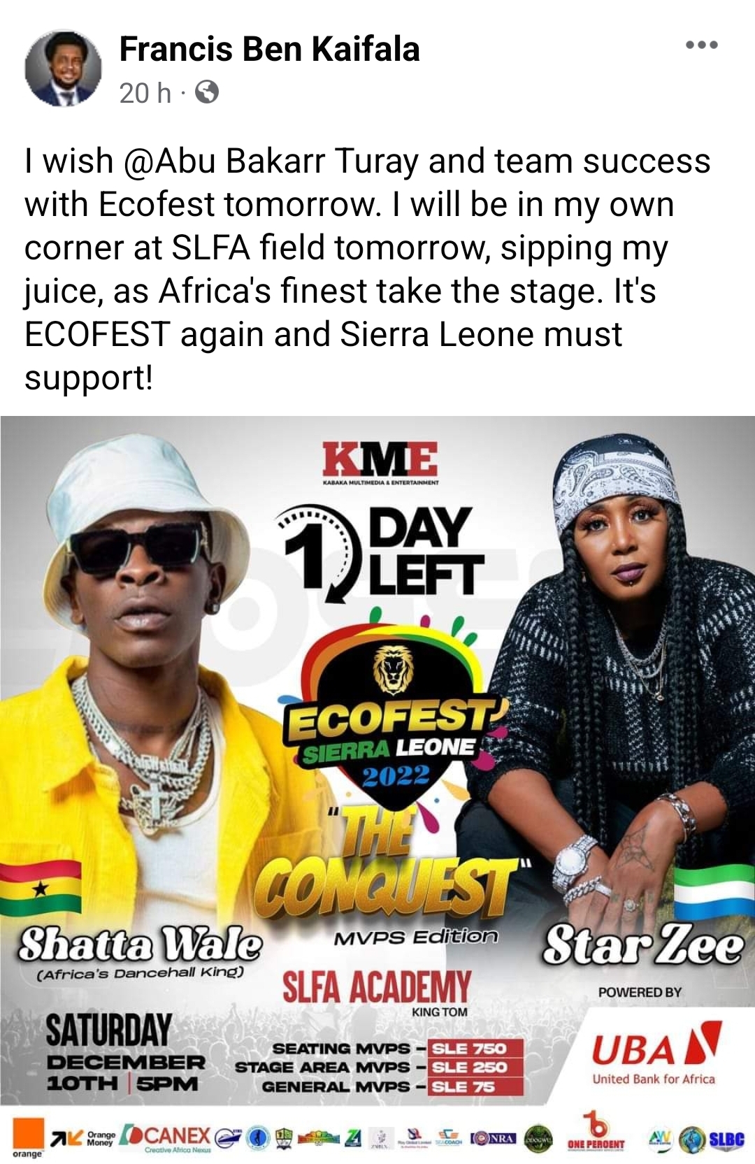 “I wish @Abu Bakarr Turay and team success with Ecofest. I will be in my corner at SLFA field tomorrow, sipping my juice, as Africa’s finest take the stage. It’s ECOFEST again and Sierra Leone must support it!”