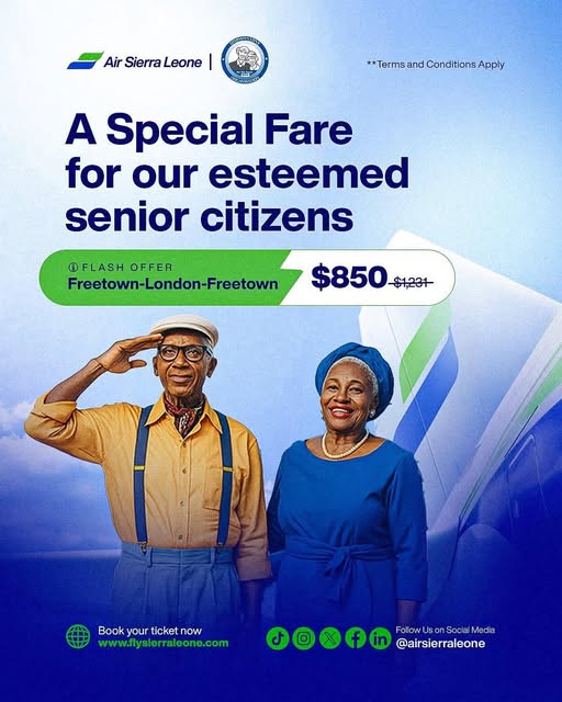 Under this initiative, senior passengers aged 60 and above can enjoy a special return fare of just $850 from Freetown to London. The offer is a token of appreciation for the invaluable contributions and legacy of the nation’s senior citizens.