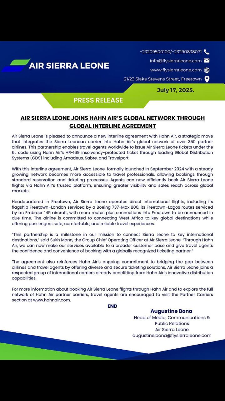 “This partnership is a milestone in our mission to connect Sierra Leone to key international destinations,” said Sukh Mann, the Group Chief Operating Officer at Air Sierra Leone. “Through Hahn Air, we can now make our services available to a broader customer base and give travel agents the confidence and convenience of booking with a globally recognized ticketing partner.”