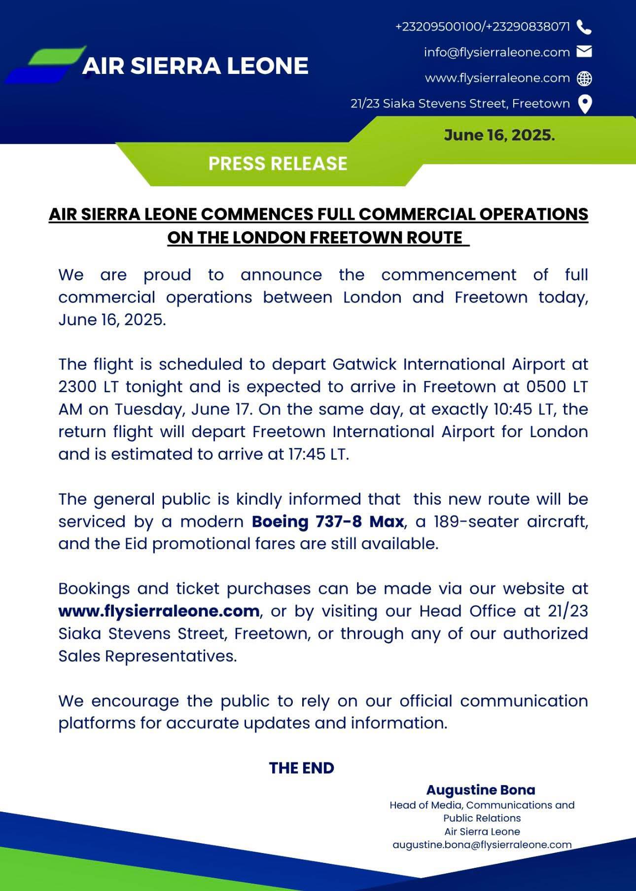 Air Sierra Leone has announced the launch of full commercial flight operations between London and Freetown, effective today Monday, June 16, 2025.