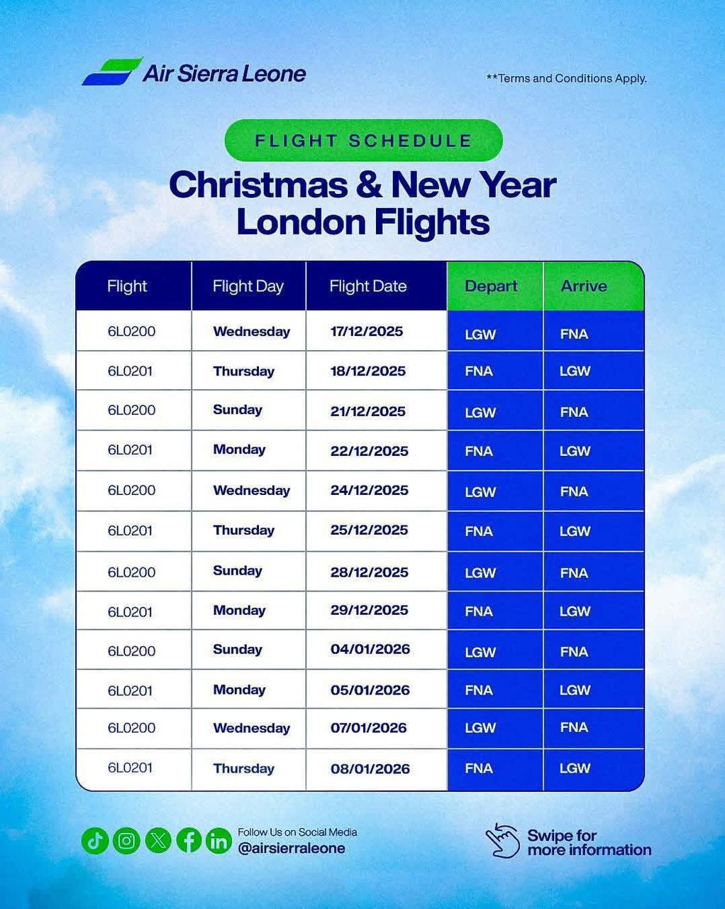 Air Sierra Leone has officially launched its Christmas and New Year London flight schedule for the 2025/2026 festive season, offering passengers greater flexibility and the opportunity to plan ahead.