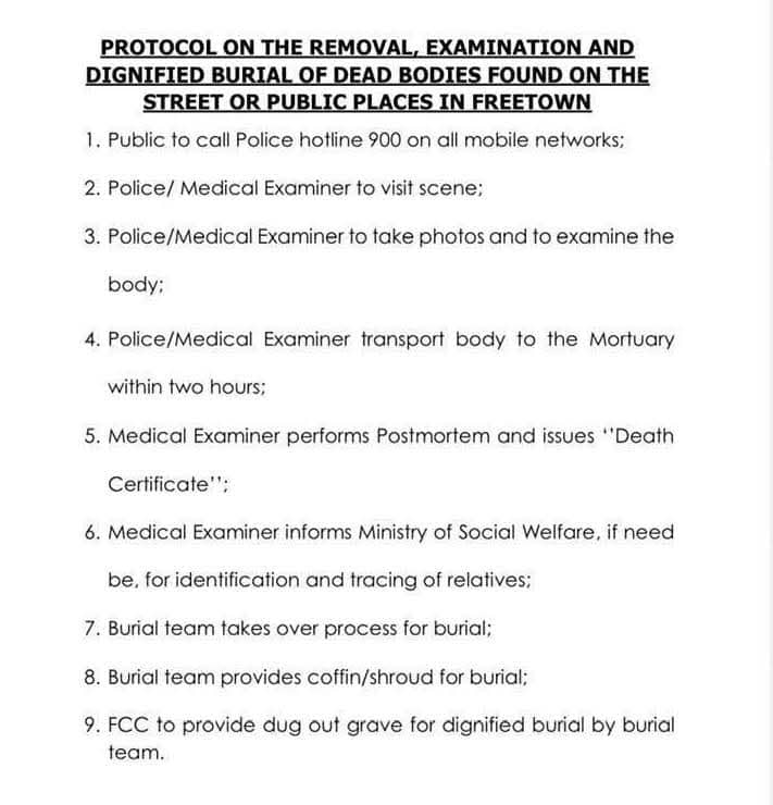 Residents are now advised not to contact the FCC for the removal of deceased persons found in public. Instead, the Sierra Leone Police has been designated as the primary first responder.