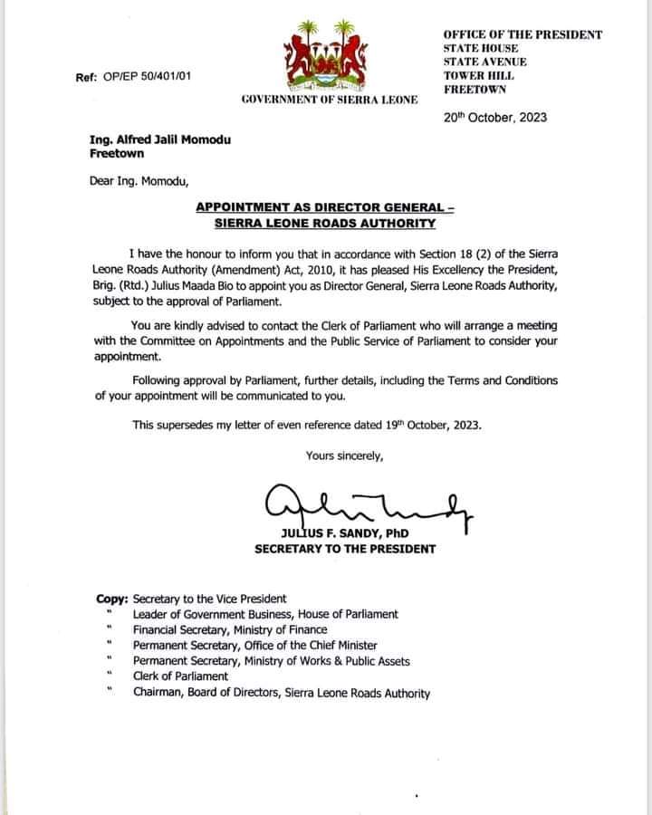 According to the letter, Ing. Momodu’s appointment is by section 18 (2) of the Sierra Leone Roads Authority Amendment Act of 2010.