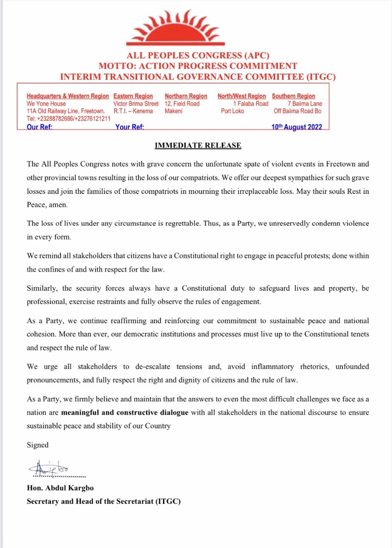 The All People’s Congress as the main opposition party has also made a statement which they start by sympathizing with families who lost their loved ones through the demonstration.