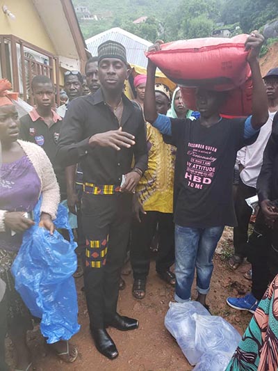 Ex-Housemate of the Housemates Salone Yagba Season 3 show and Brand Ambassador for Afrimoney, Almon Sall, has visited the Looking Town community in the east end of Freetown to sympathize with victims of the August 27 and 28 flood and mudslide.