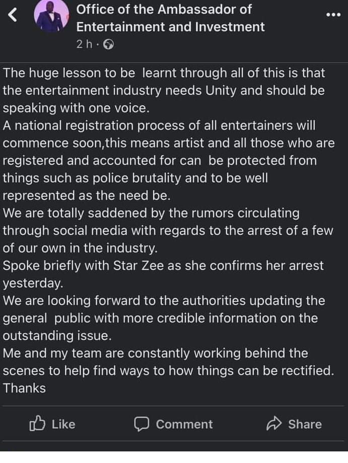 The office of the Ambassador of Entertainment And Investment has in a Social Media post today 16 June 2022 calls for unity in the entertainment industry and proposed a national registration process for all Entertainers.