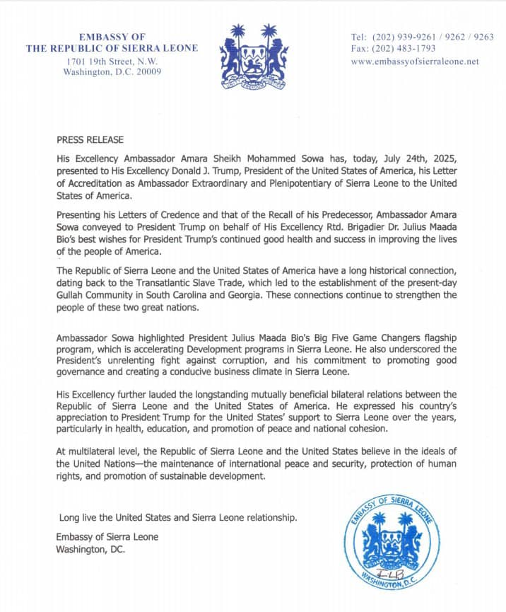 In a ceremony held on July 24, 2025, Ambassador Sowa conveyed greetings and best wishes from President Brigadier Dr. Julius Maada Bio to President Trump. The ambassador emphasized President Bio’s hopes for President Trump’s continued good health and success in enhancing the lives of the American people.
