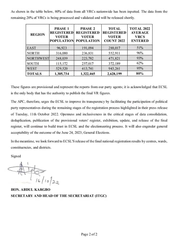 The All People’s Congress (APC) has released 80 percent of its provincial figure for the just concluded voter registration exercise across the country.