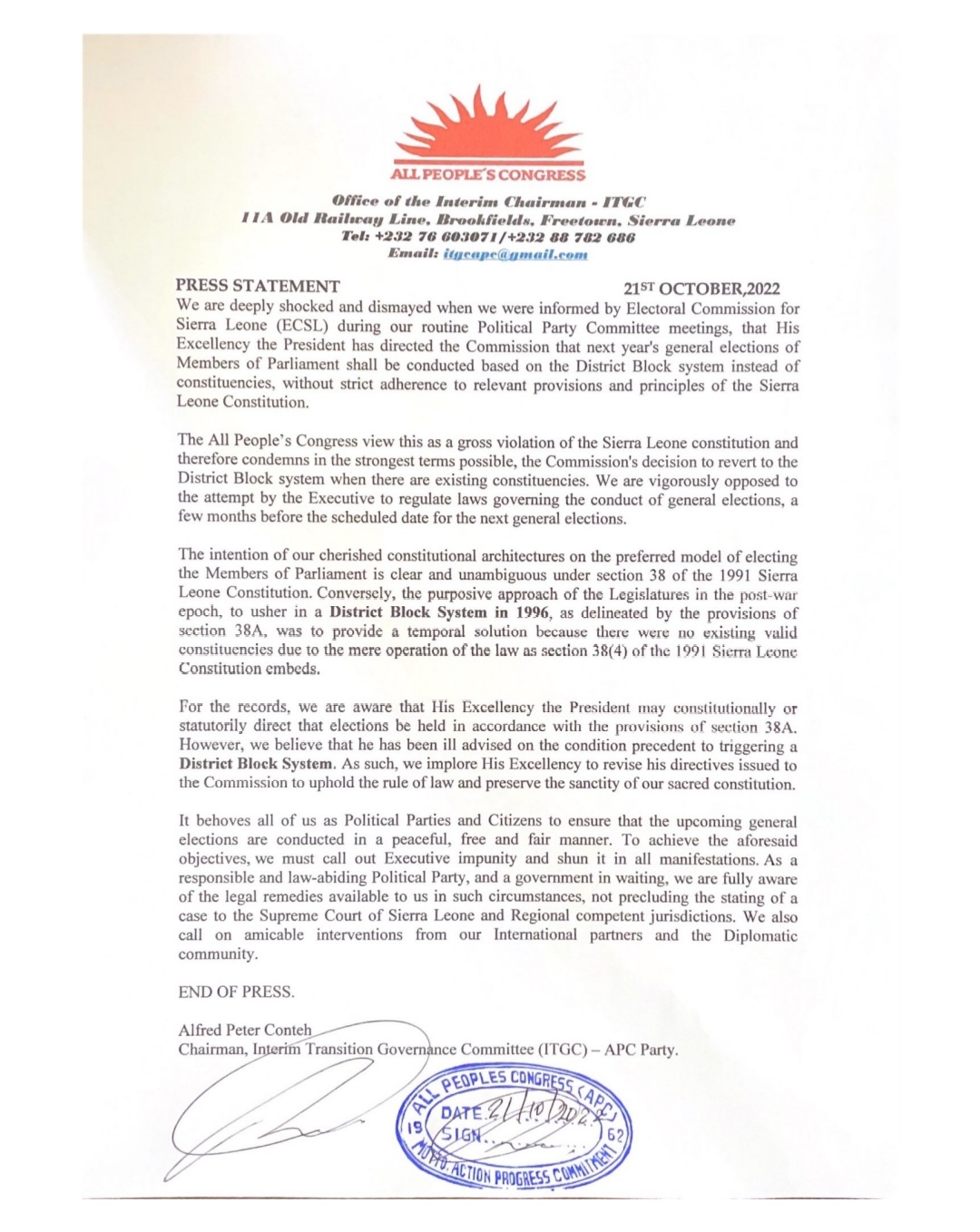 The All People’s Congress view this as a gross violation of the Sierra Leone constitution and therefore condemns in the strongest terms possible, the Commission’s decision to revert to the District Block system when there are existing constituencies. We are vigorously opposed to the attempt by the Executive to regulate laws governing the conduct of general elections, a few months before the scheduled date for the next general elections.