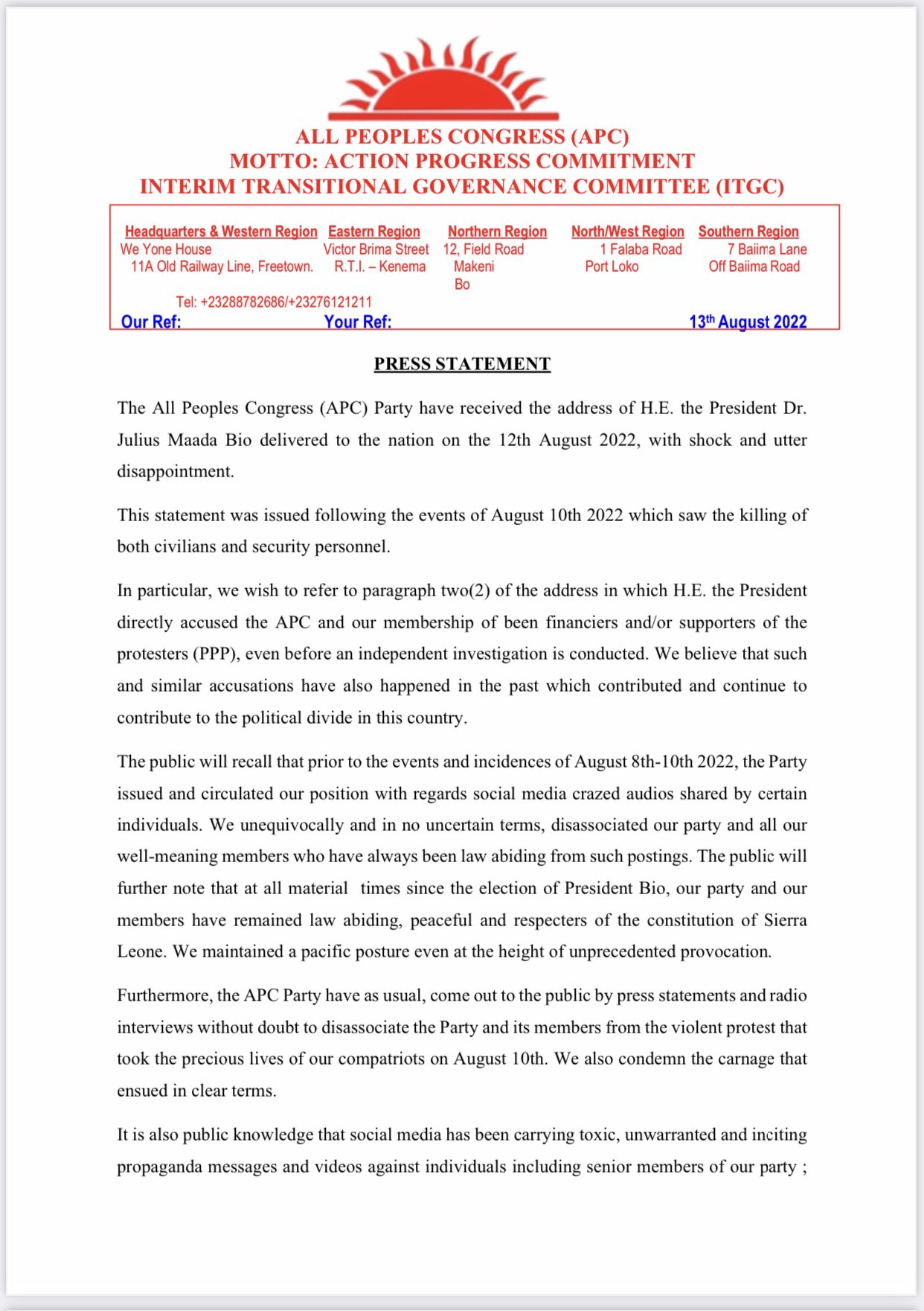 The opposition party stated that they are shock and disappointed at the accusations President Bio levied against them following the events of August 10th 2022, which saw the killing of both civilians and security personnel.