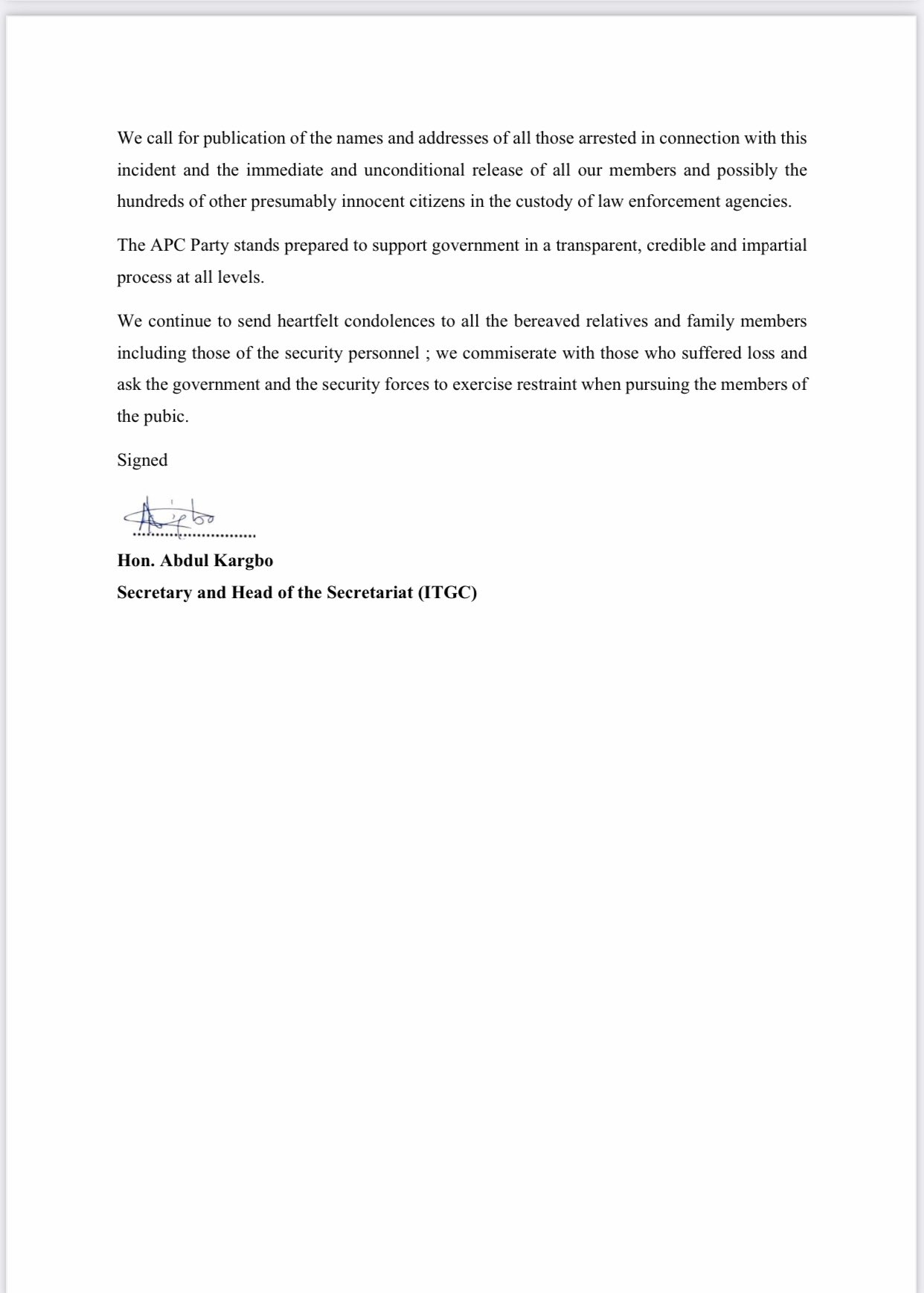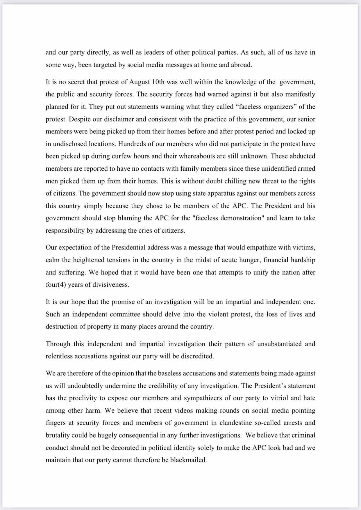 “In particular, we wish to refer to paragraph two(2) of the address in which H.E. the President directly accused the APC and our membership of been financiers and/or supporters of the protesters (PPP), even before an independent investigation is conducted. We believe that such and similar accusations have also happened in the past which contributed and continue to contribute to the political divide in this country,” APC stated.