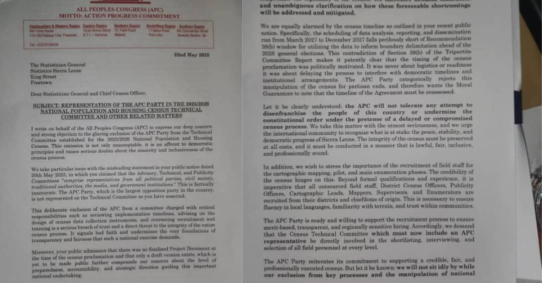 In a letter addressed to the Chief Census Officer, the APC challenged a recent public notice from Statistics Sierra Leone (Stats SL) that claimed the Advisory, Technical, and Publicity Committees “comprise representatives from all political parties.”