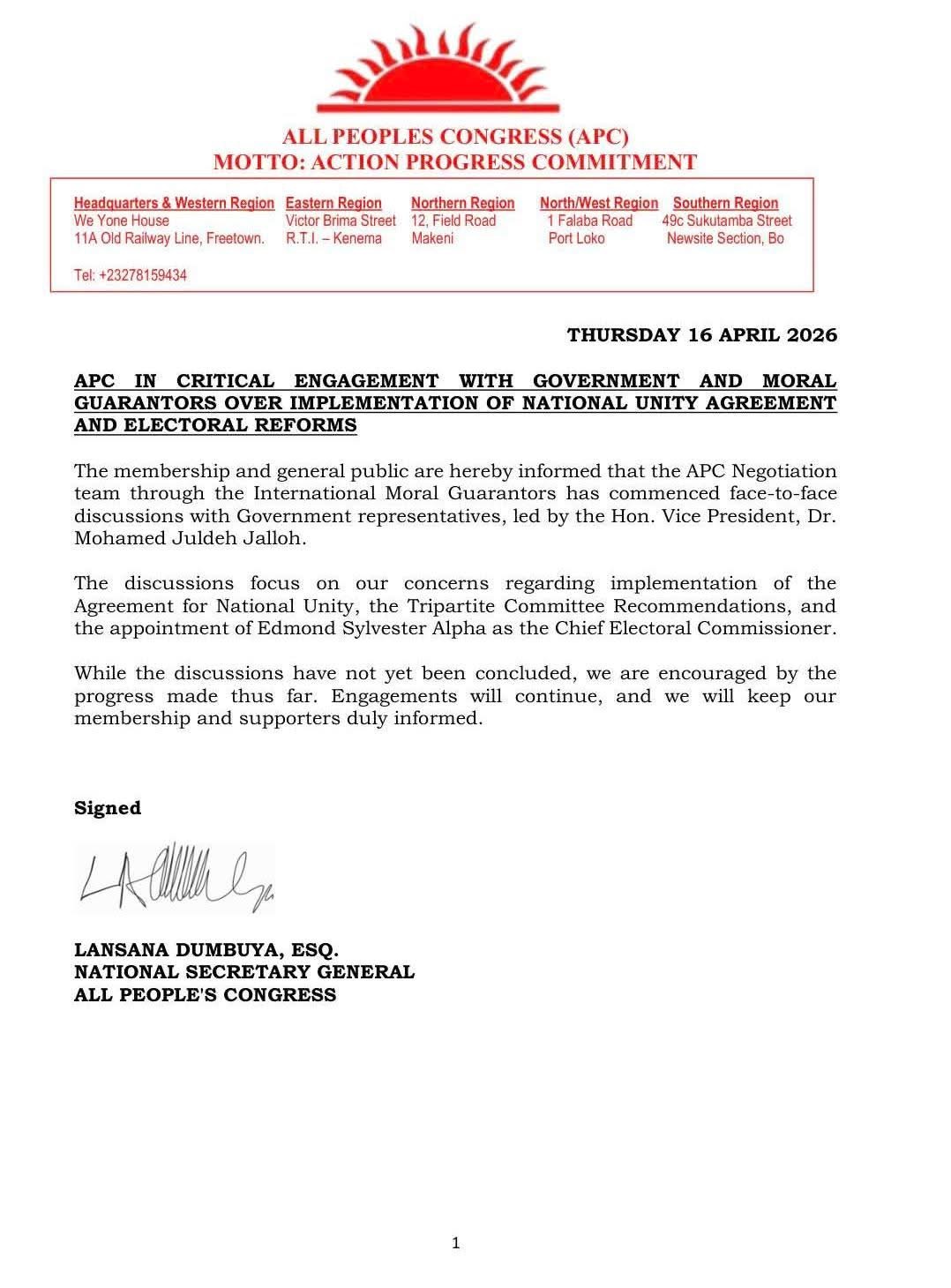 According to a public notice issued on Thursday, April 16, 2026, the APC Negotiation Team is engaging the Government through the facilitation of International Moral Guarantors. The Government delegation is being led by Vice President, Dr. Mohamed Juldeh Jalloh.