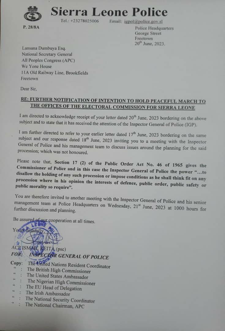 The All Peoples Congress (APC) has received a further notification from the Inspector General of Police (IGP) regarding their intention to hold a peaceful march to the offices of the Electoral Commission for Sierra Leone.