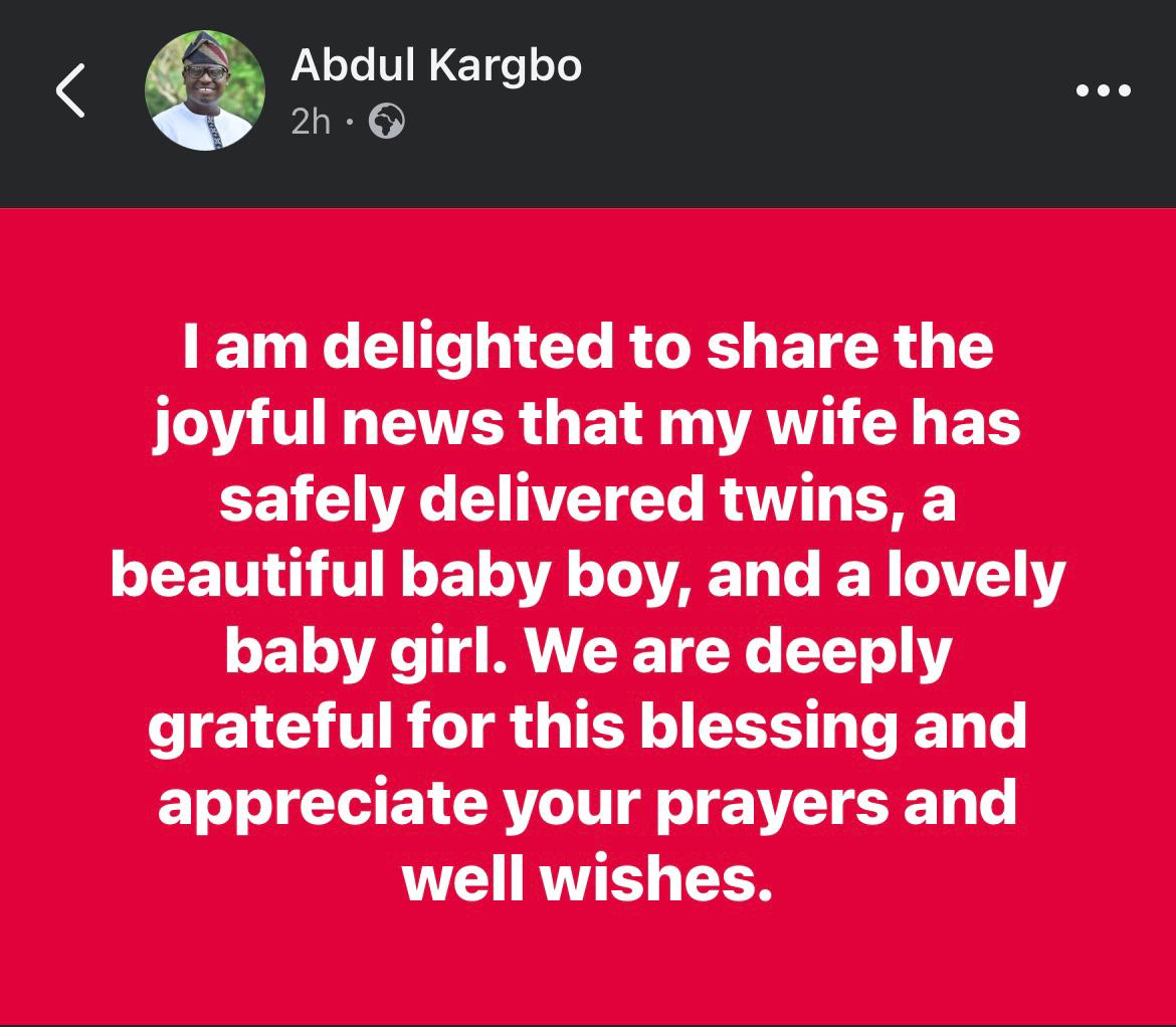 Kargbo made the announcement on a Facebook post stating, “I am delighted to share the joyful news that my wife has safely delivered twins, a beautiful baby boy and a lovely baby girl. We are deeply grateful for this blessing and appreciate your prayers and wishes.”