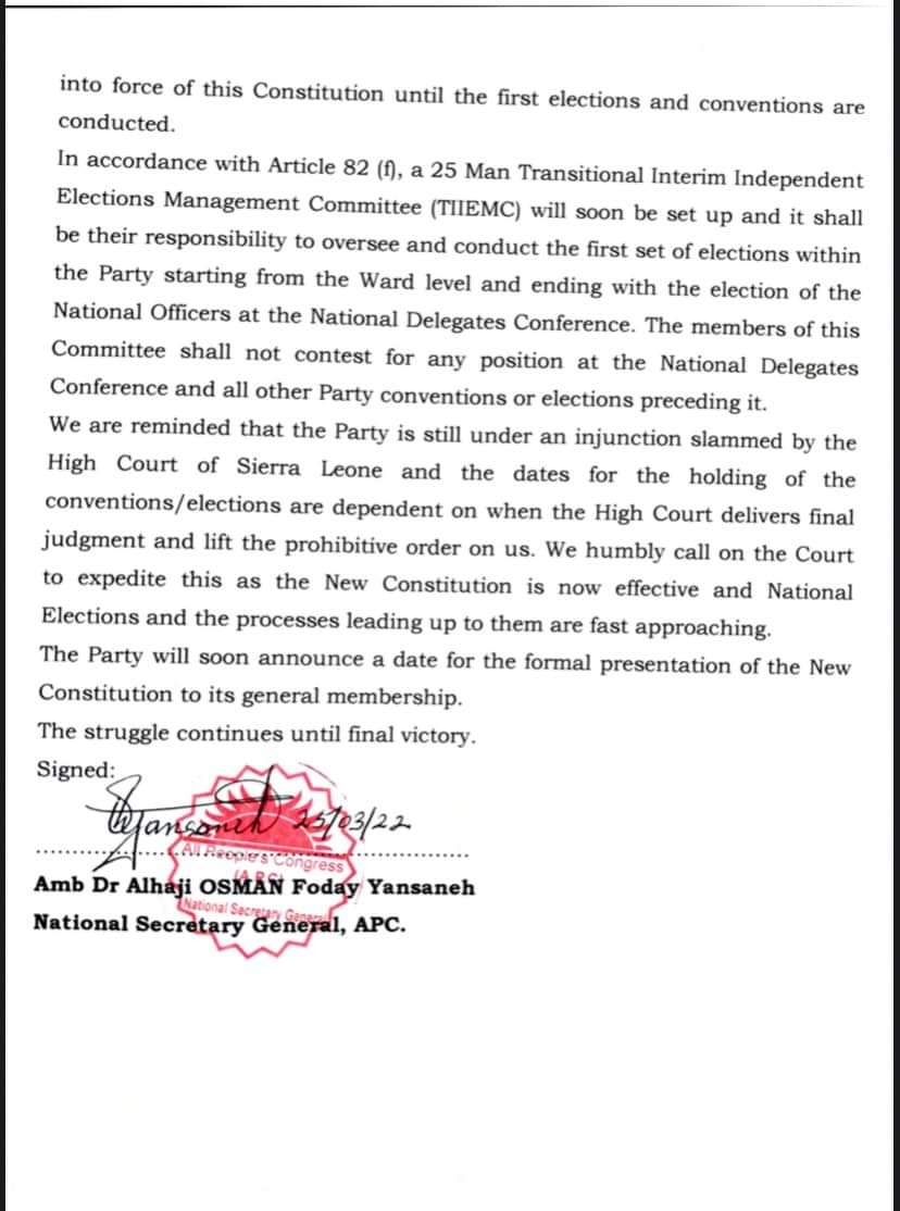 “Fellow Comrades of the All People’s Congress (APC) and Members of the general public, today the 25th of March 2022 marks an important day in the history of the APC. We are transitioning into a new legal regime. The 1995 Constitution of the Party has been repealed and replaced by a New Constitution adopted on the 19th of September 2021. By ruling of the Political Parties Registration Commission (PPRC), this New Constitution takes effect from today the 25th of March 2022.” The press release stated.